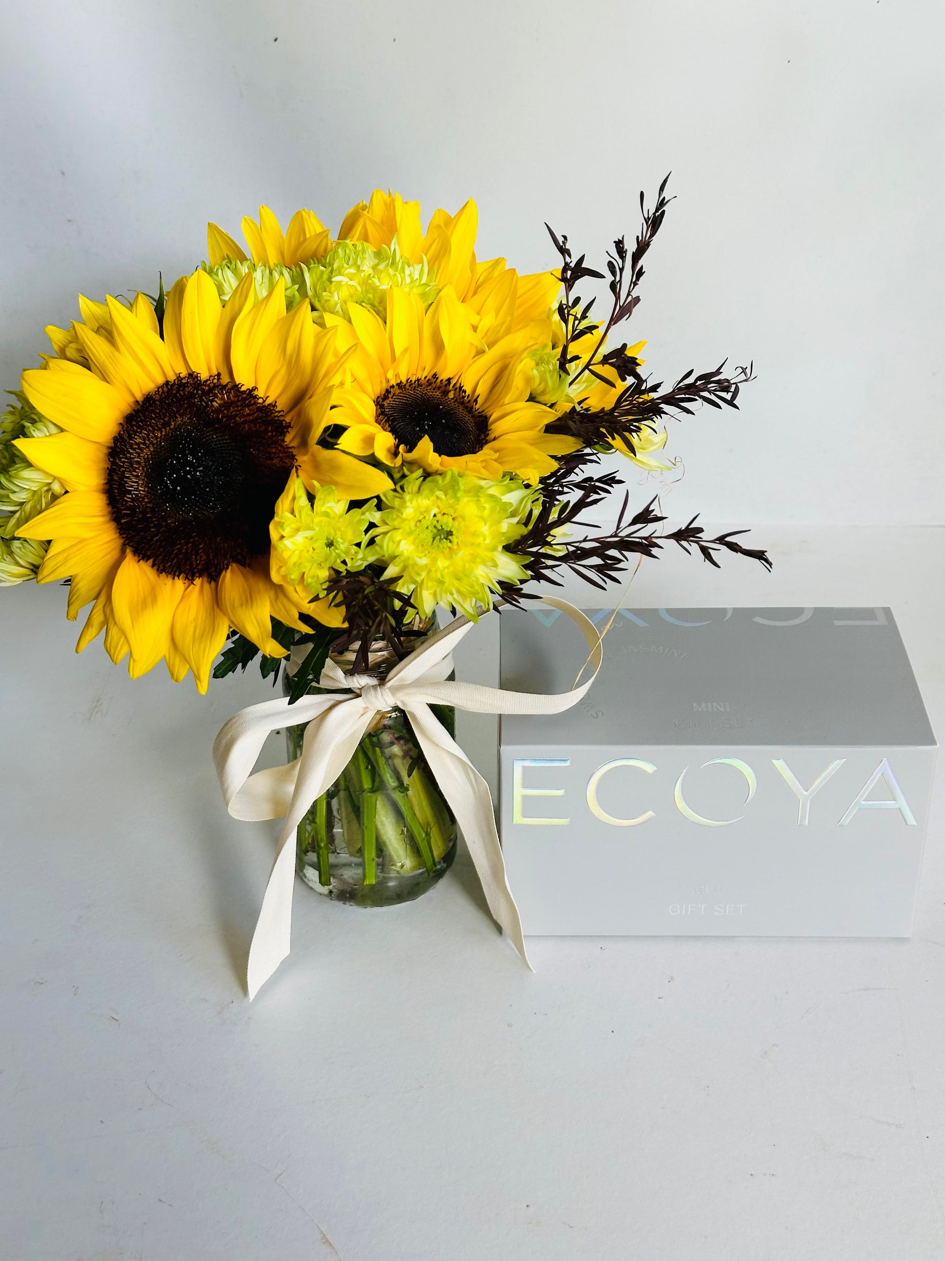 Spoil someone you love, thank a corporate client, or wish a speedy recovery with our Standard Gift Package! This delightful package includes a beautiful posy of flowers in a vase and an Ecoya Gift Set featuring a candle and mini diffuser.